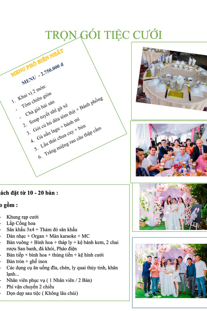 Mình đã có cơ hội trải nghiệm dịch vụ bên đặt tiệc này. Theo đánh giá cá nhân mình thì số lượng từng món khá nhiều, món ăn nêm nếm cũng vừa phải chắc để hợp cho khách ở nhiều miền khác nhau. Phục vụ thì mấy em còn trẻ tuôi nhưng siêng và vui vẻ . Đối với riêng mình đặt tiệc ở tại nhà mình mà đồ ăn với phục vụ vậy là ổn rồi.